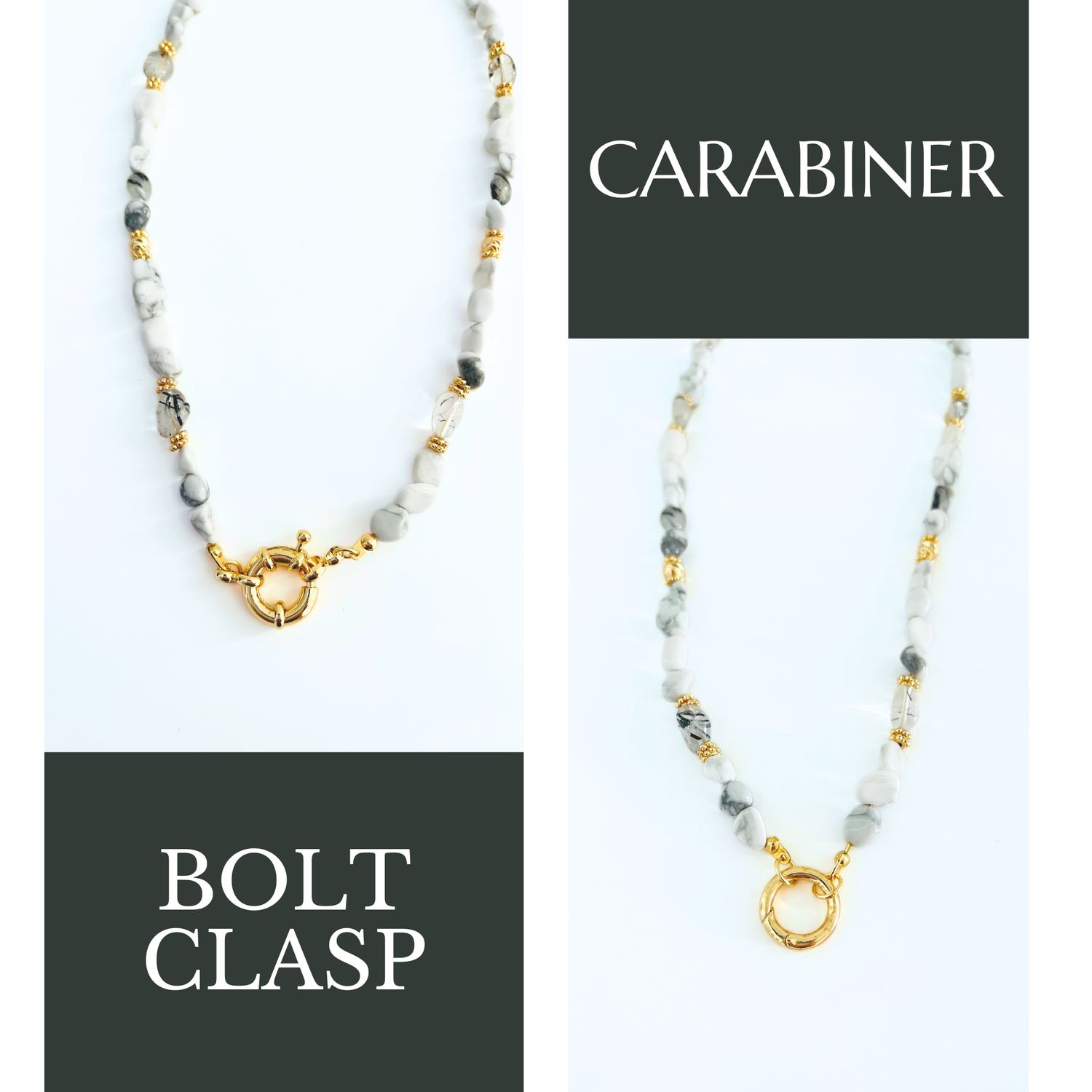 Identify the main connector ( Carabiner Ring or Bolt Clasp) on the Gemstone necklace chain and gently open the mechanism.