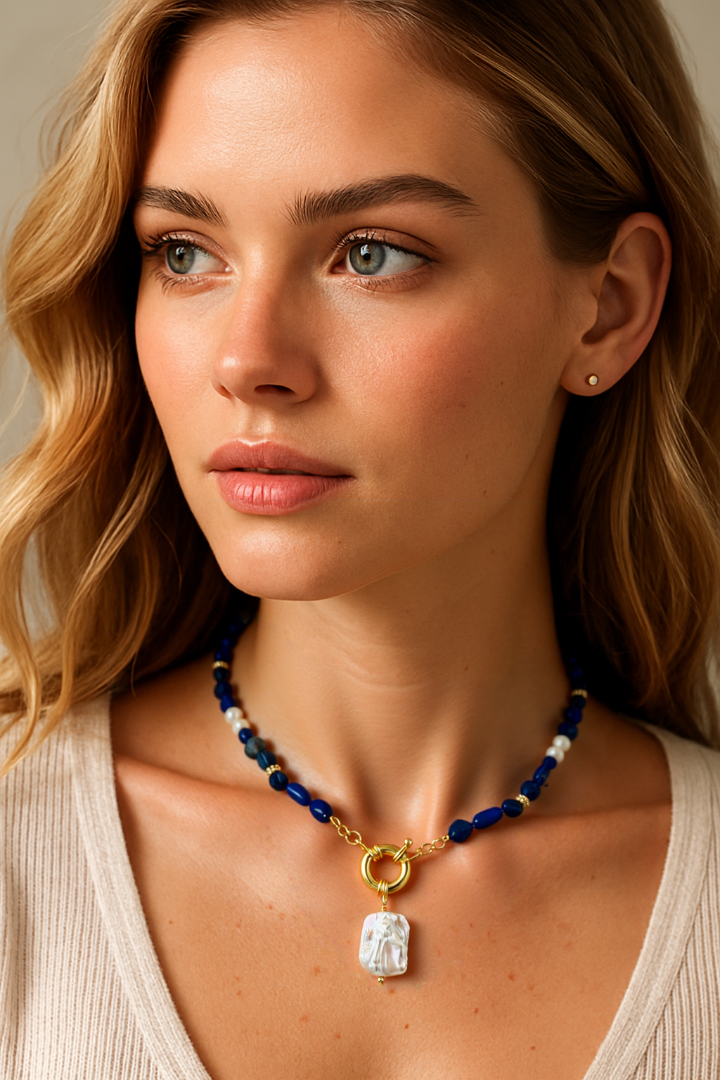 Lapis Lazuli & Pearl Gemstone Necklace - Gold Plated Interchangeable Clasp