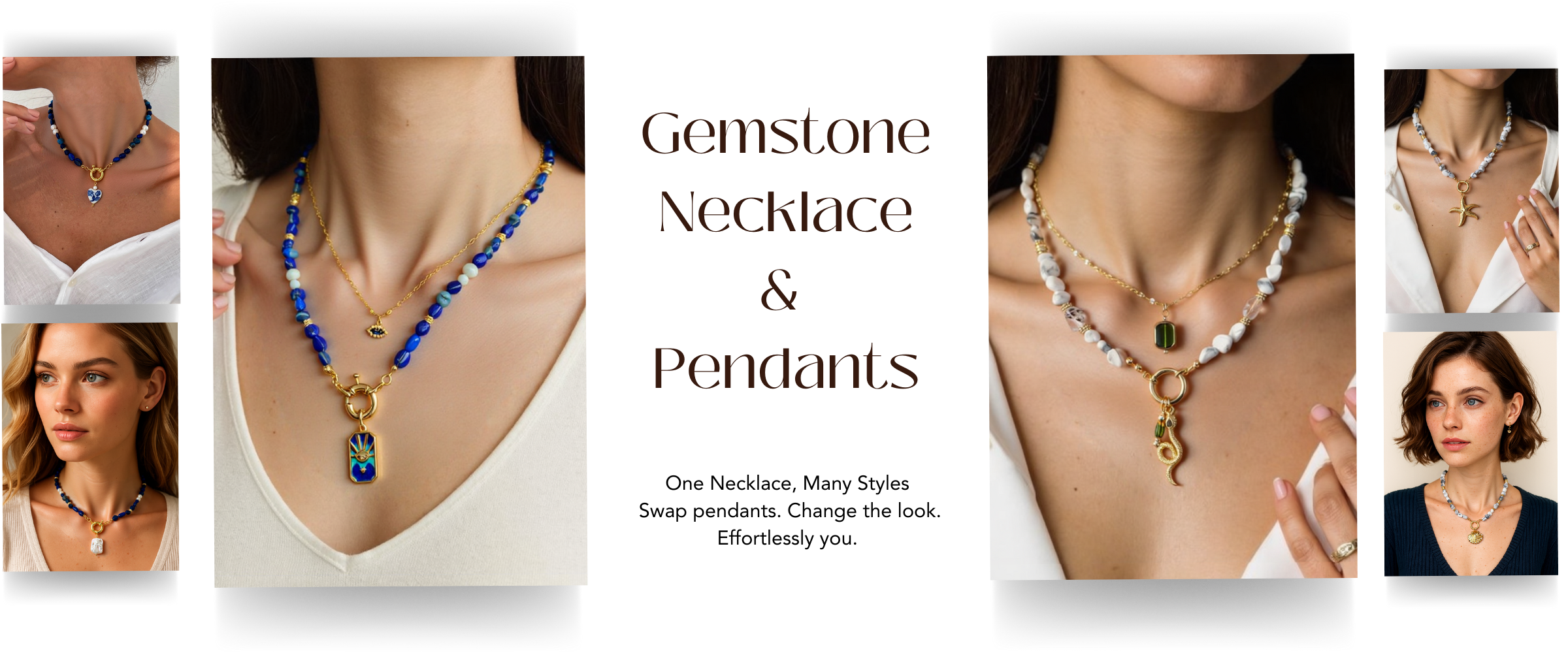 Achieve endless style with a single piece. The Interchangeable Gemstone Pendant Necklace features a secure, specialized connector, enabling you to easily swap pensants to instantly match your outfit or desired energy for the day.