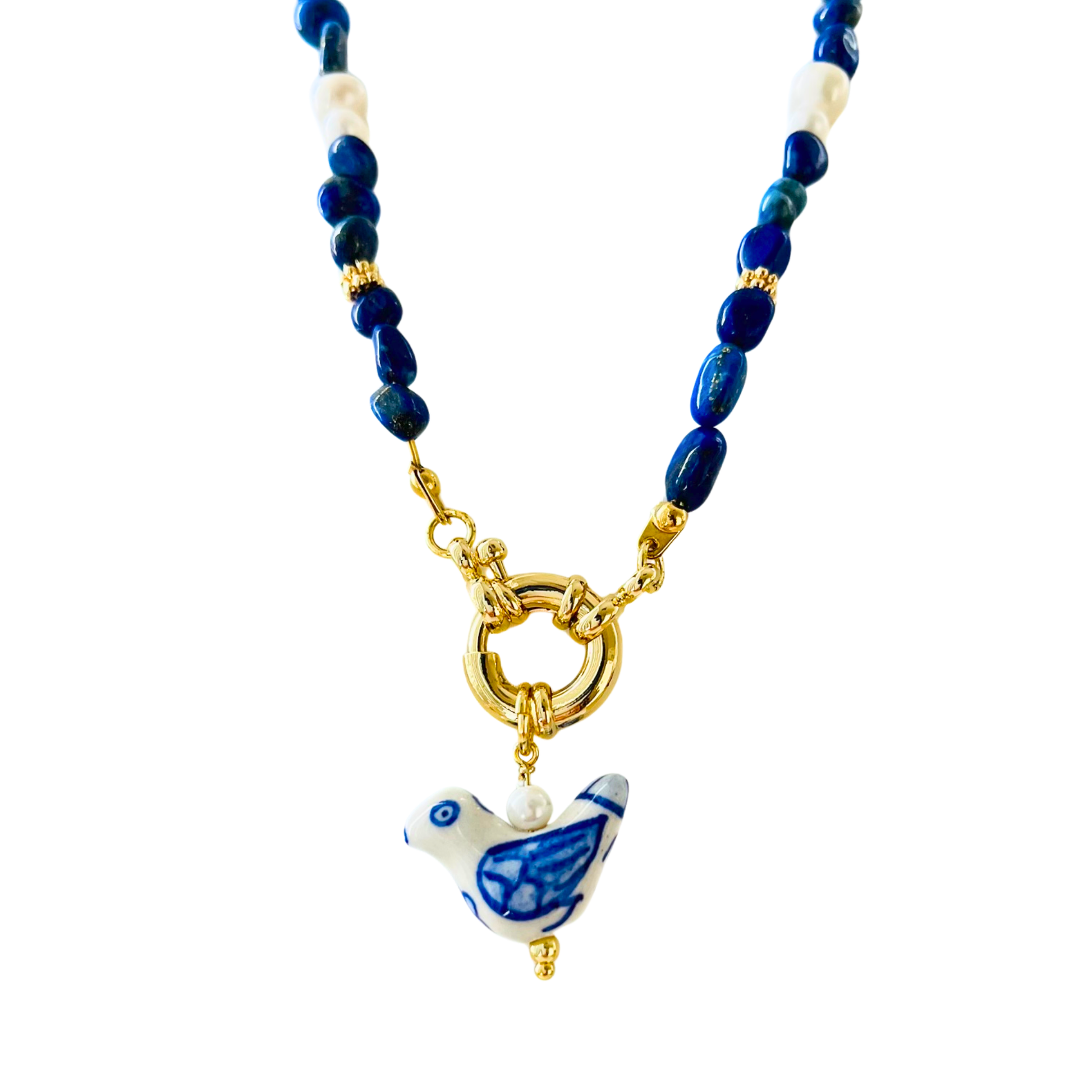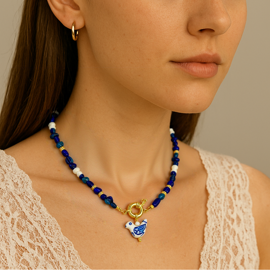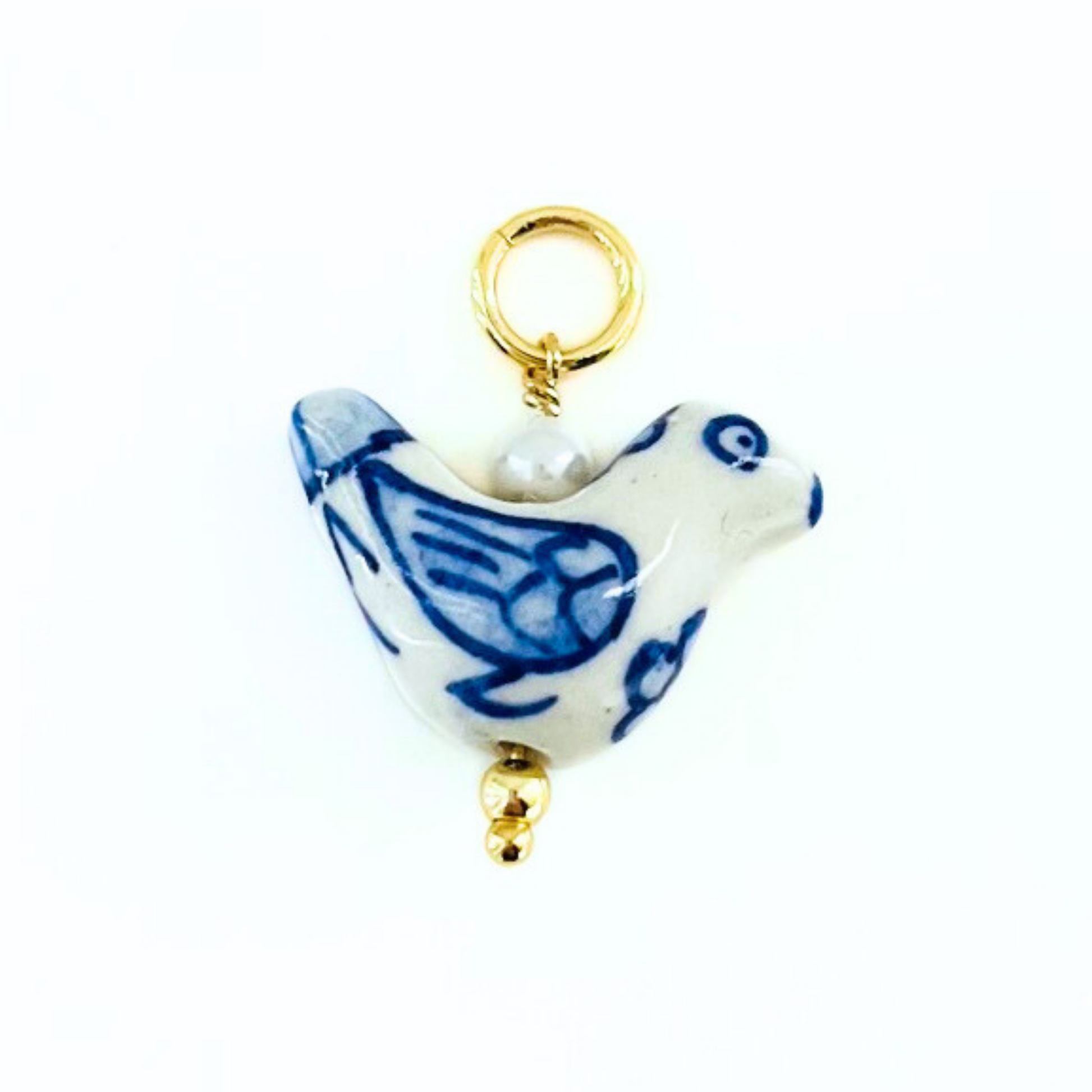 - Design: Bird charm pendant in blue and white porcelain