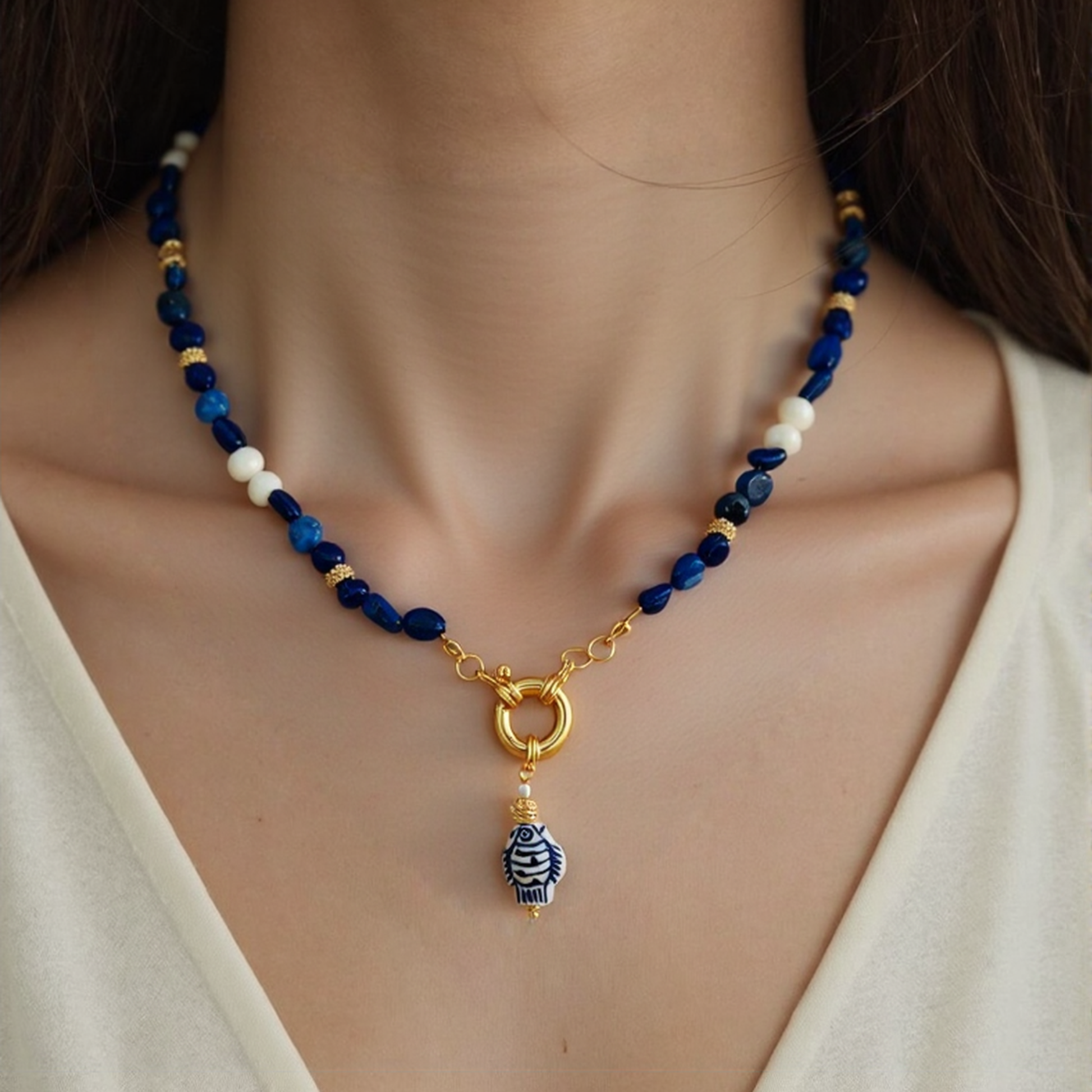 - Design: Fish charm pendant with delicate motifs in blue and white porcelain