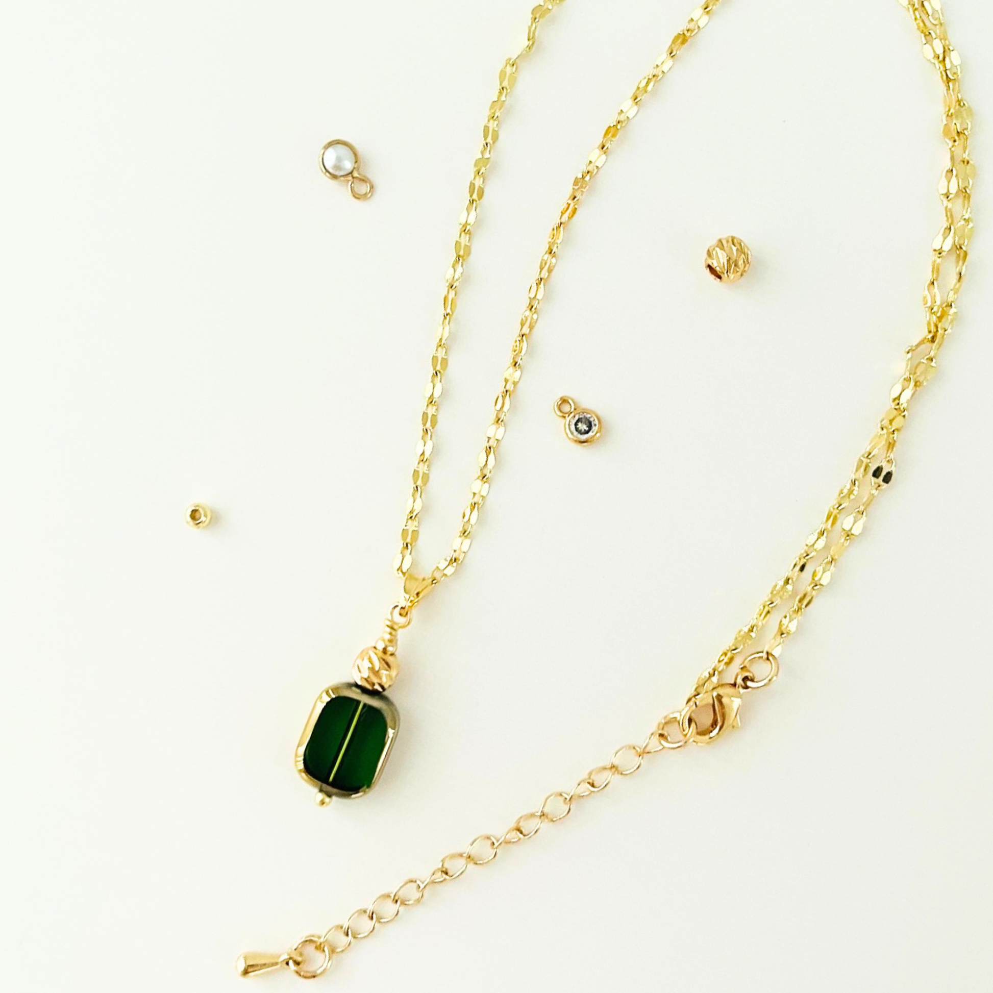 - Material: Green glass bead with gold coating edges and gold bead accents, 14K gold plated chain