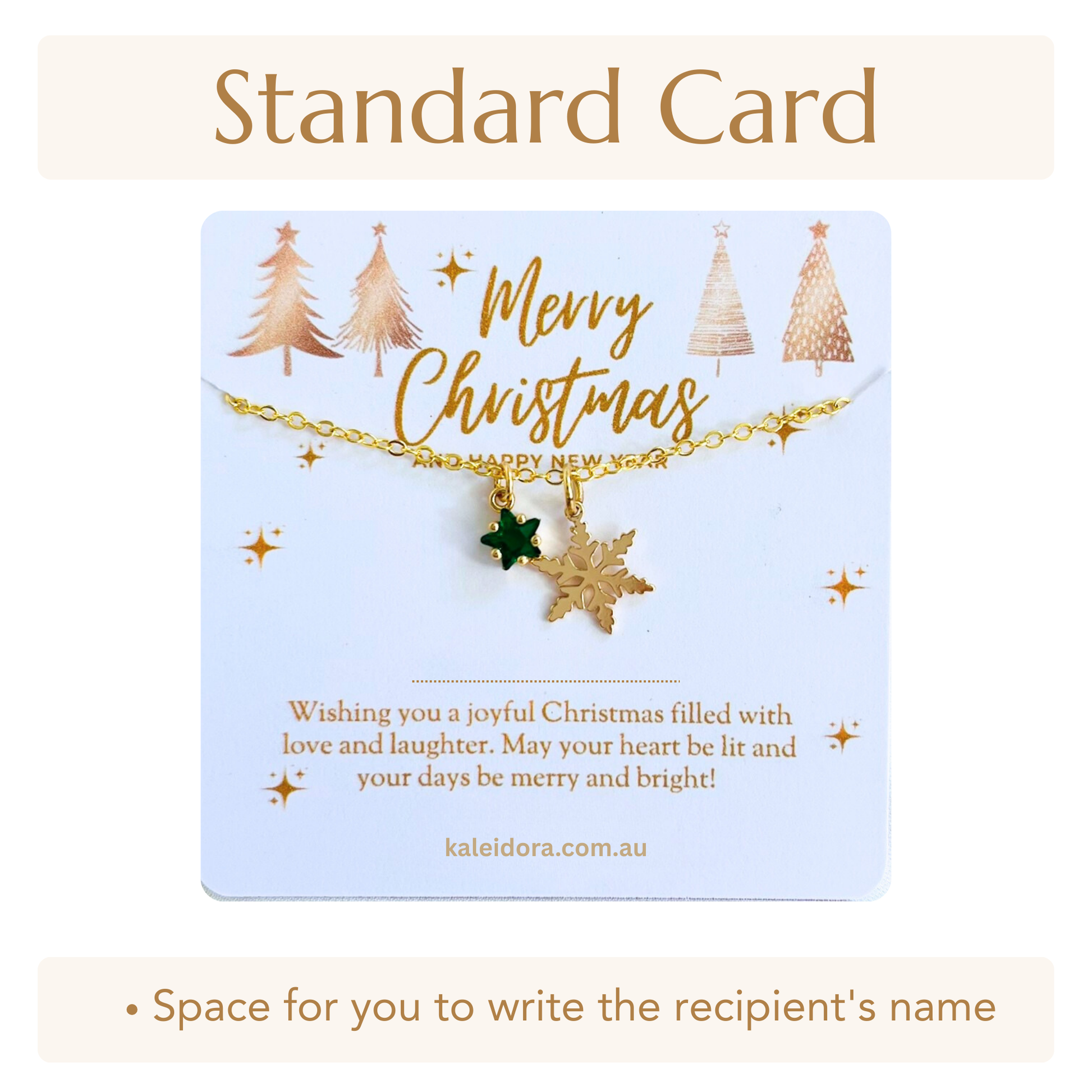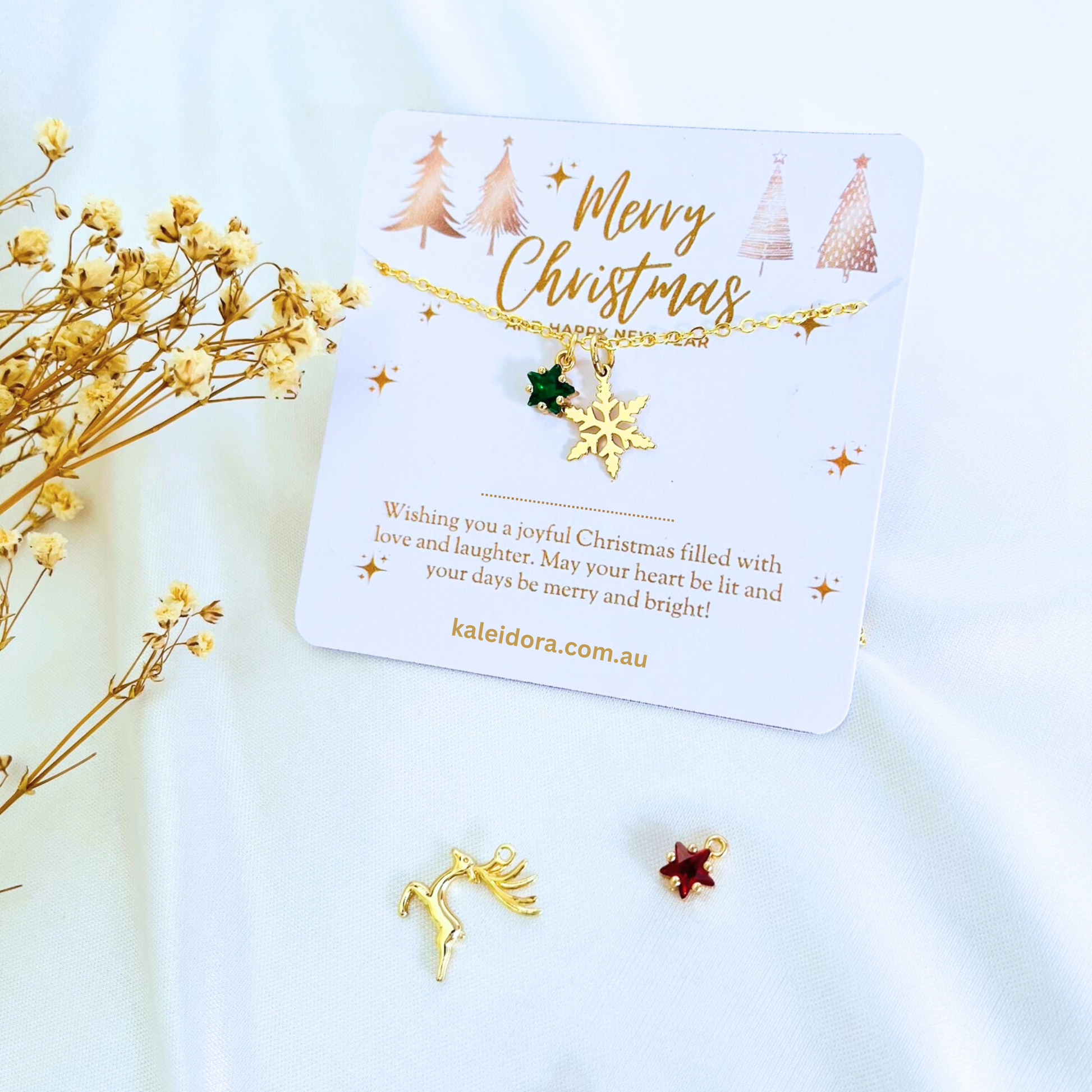 Bring festive elegance to your celebrations with this stunning green star Christmas necklace from Kaleidora, beautifully showcased on a luxurious gold greeting card. Select from three charming Christmas designs - snowflake, pinecone, or reindeer - each complemented by a sparkling green star pendant to create a festive jewellery piece that radiates holiday joy and natural beauty.