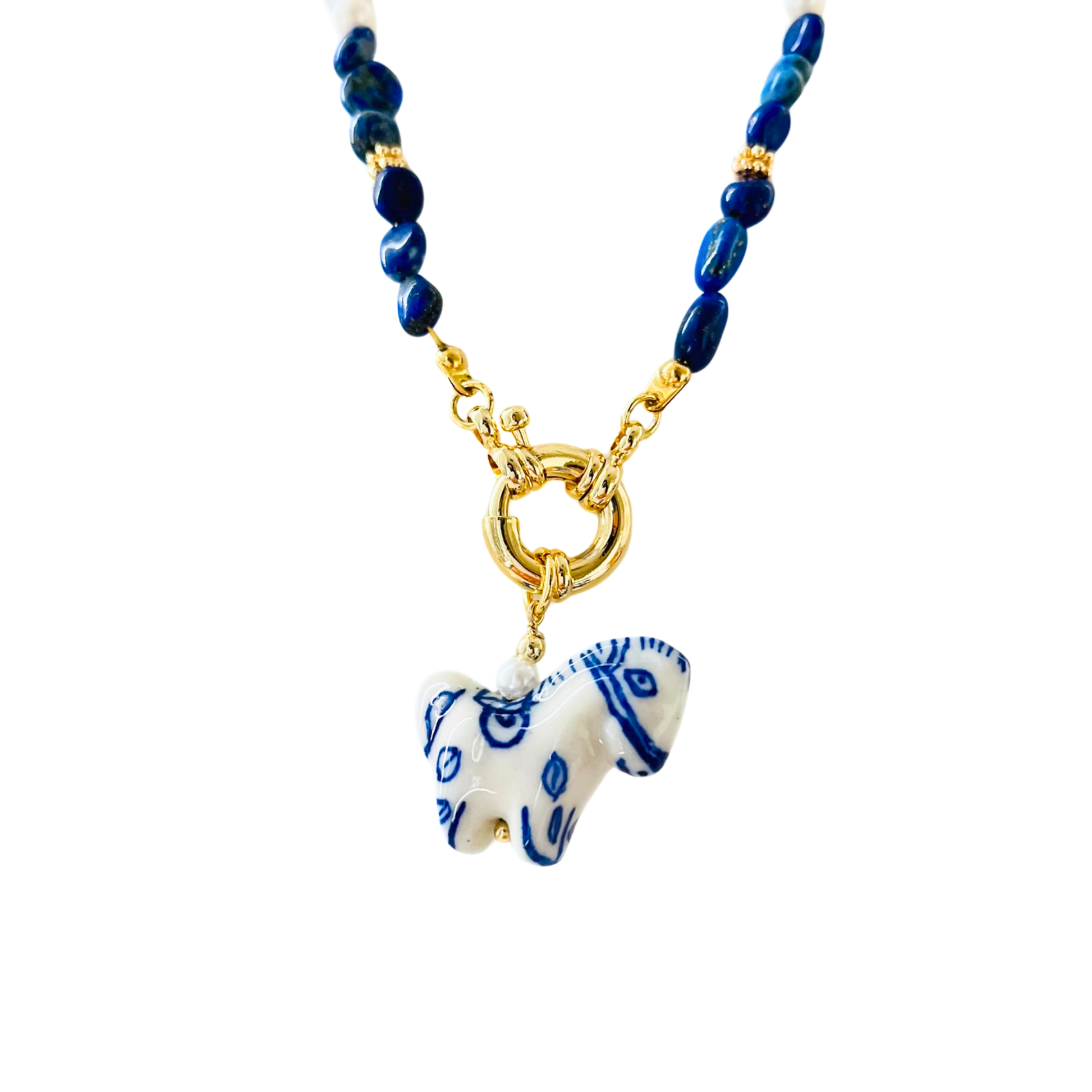 - Design: Horse charm pendant in blue and white porcelain