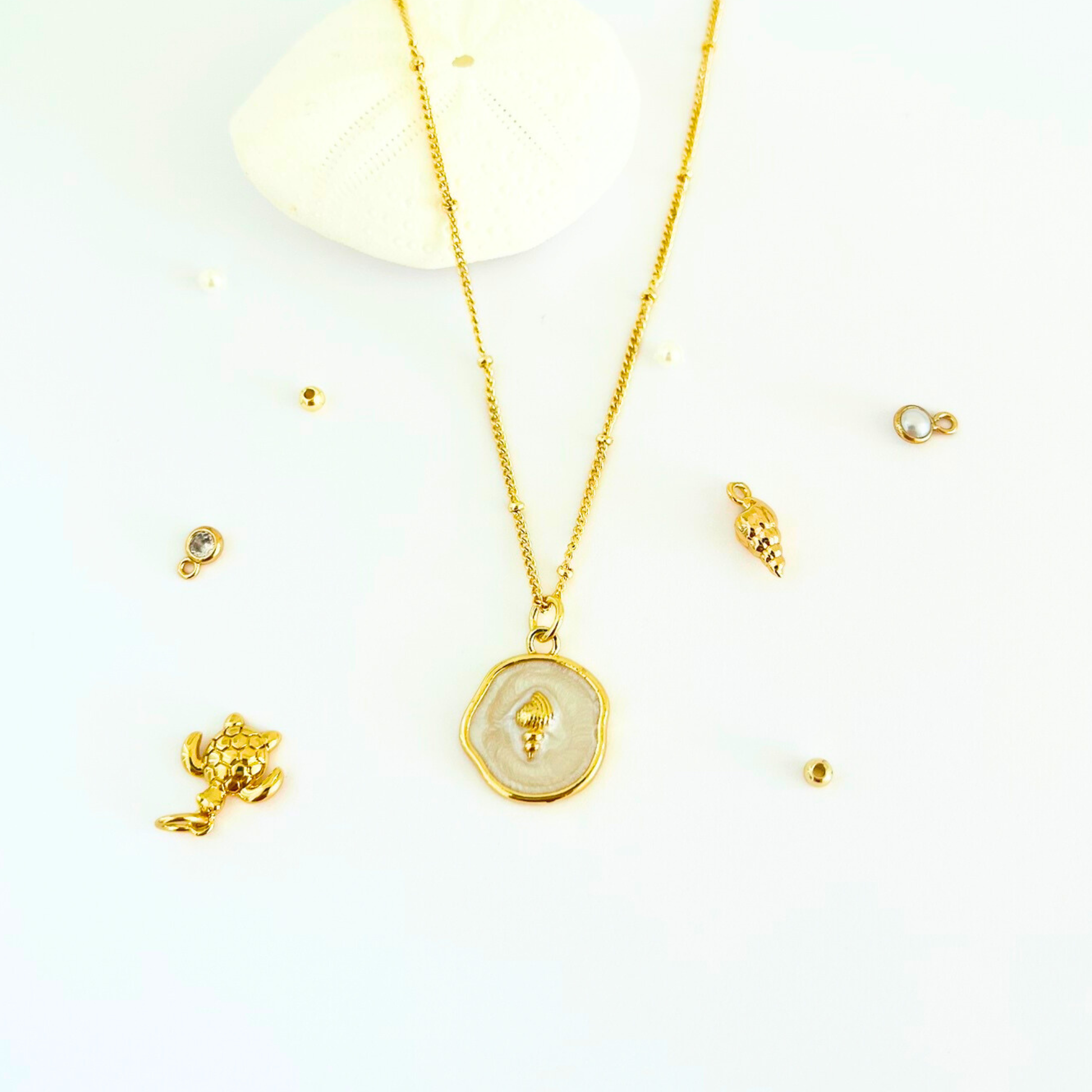 - Material: Conch seashell charm with enamel details, 14K gold plated chain with protective coating