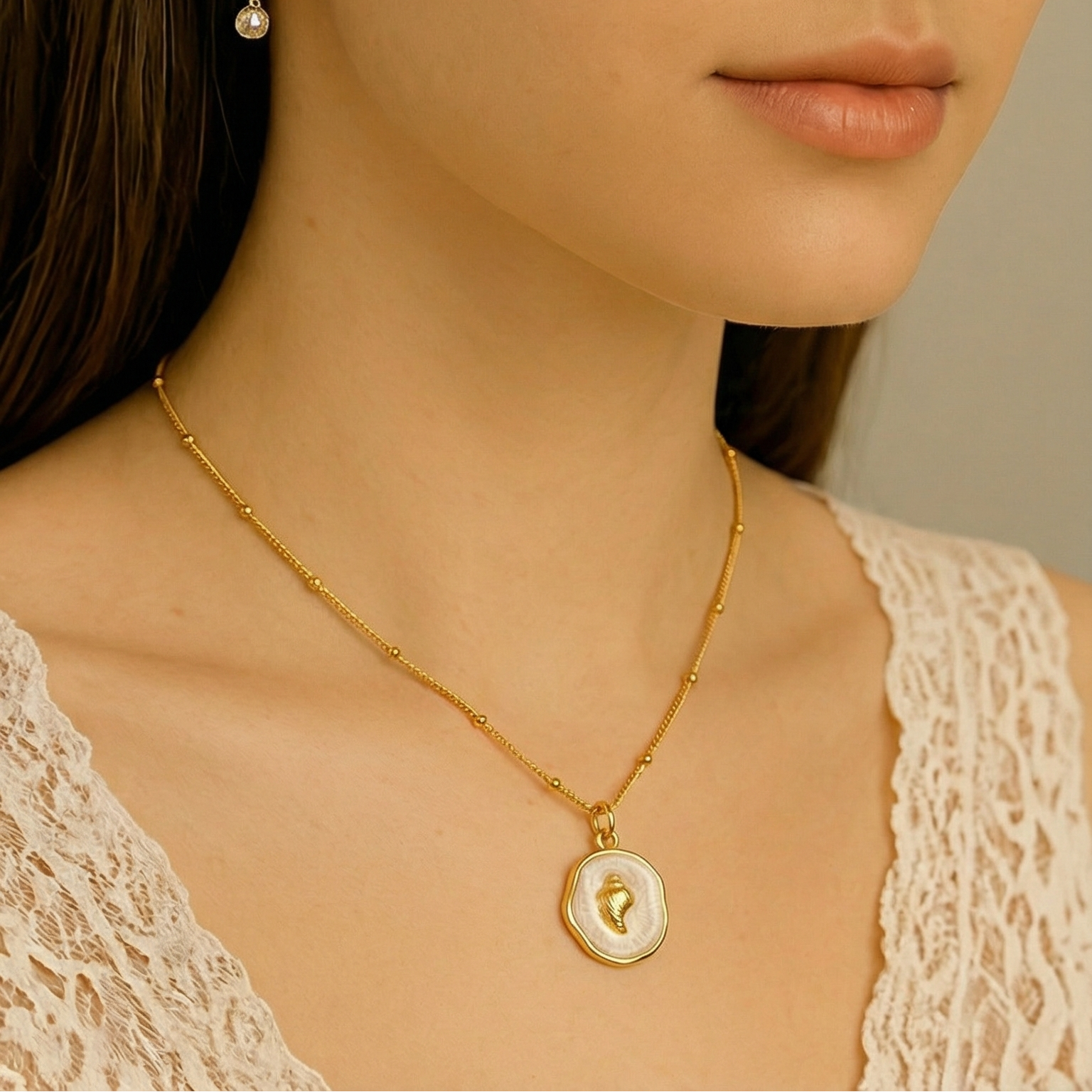 Ocean Charm Volute Shell Enamel Pendant Necklace - Gold Plated Layering Jewellery