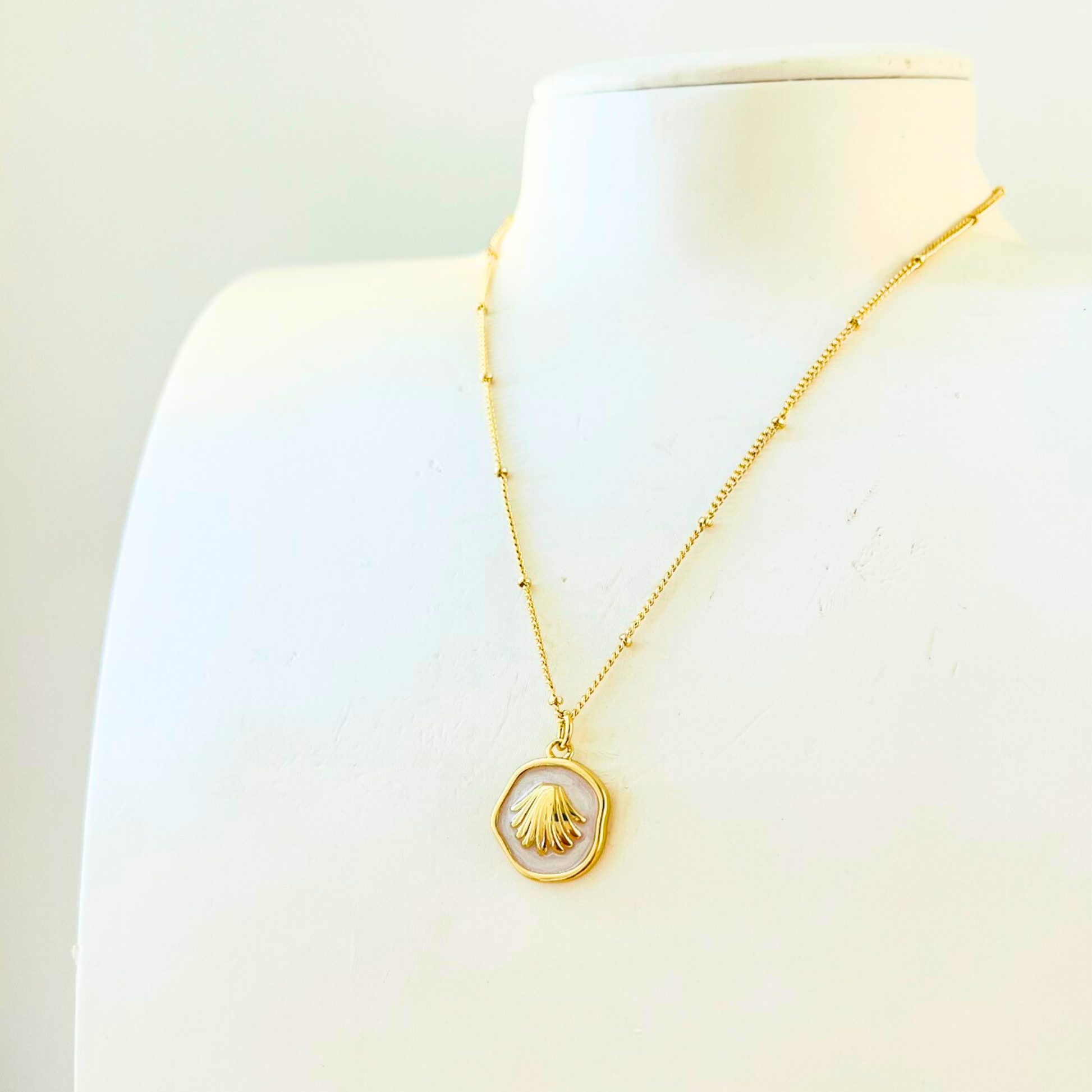 - Material: Shell charm with enamel details, 14K gold plated chain with protective coating